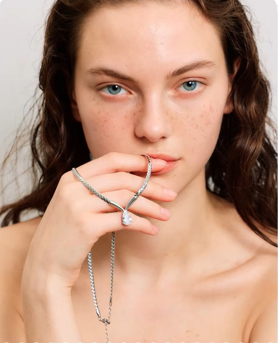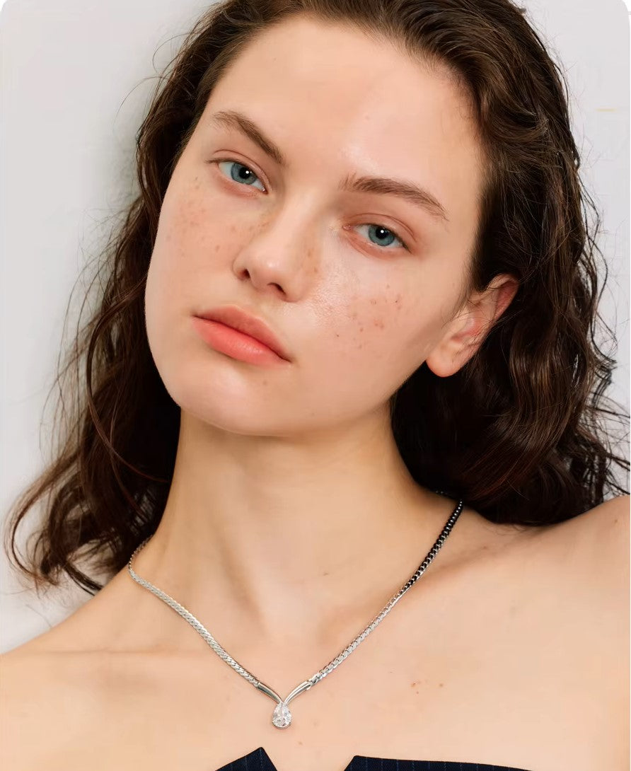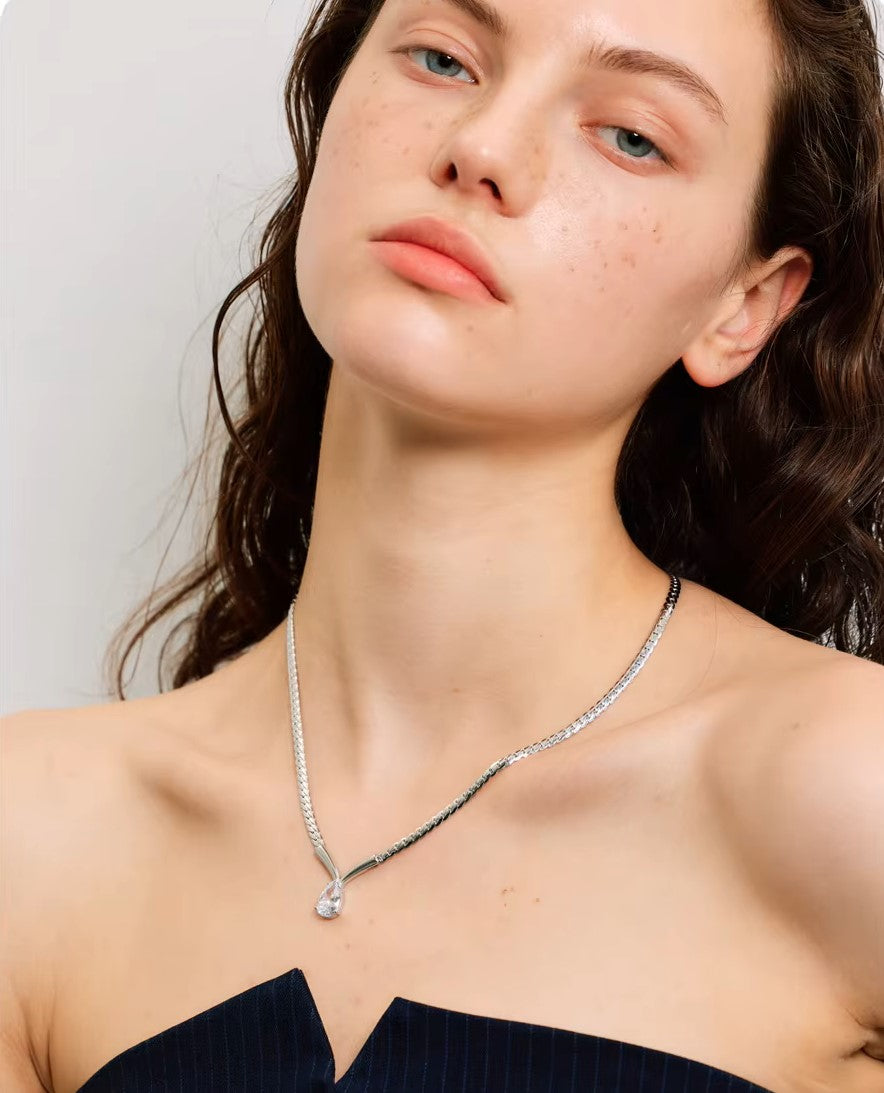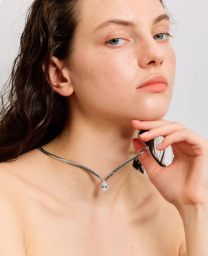 Seu design contemporâneo combina uma corrente trançada de acabamento espelhado com um pingente em formato “V”, valorizando a pedra central lapidada que reflete a luz de forma envolvente e delicada.